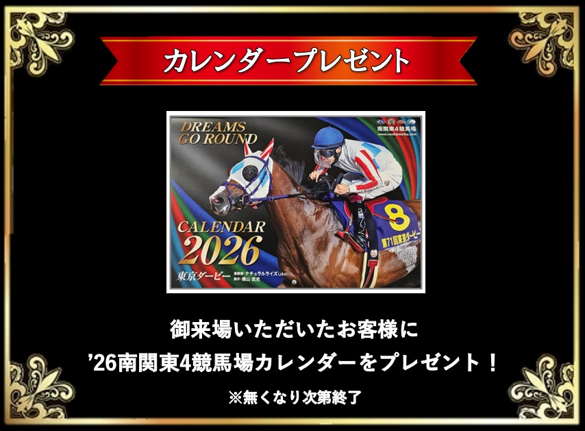 12月11日(木)より御来場いただいた皆様に「2026年南関東4競馬場カレンダー」をプレゼントいたします。