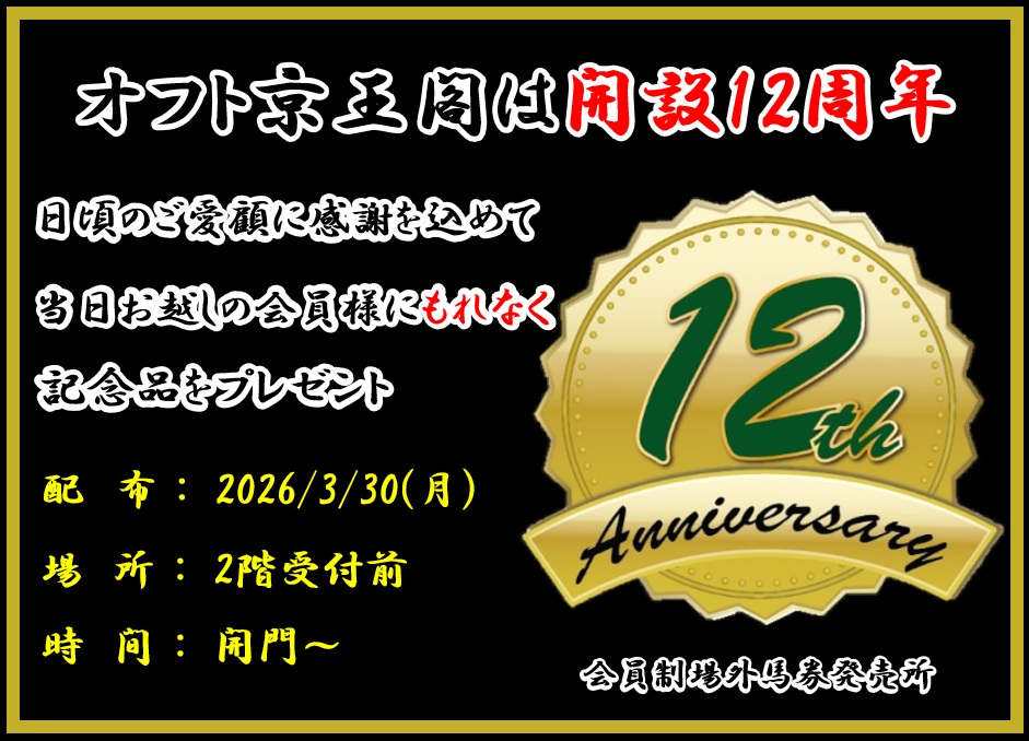オフト京王閣は、皆様のご愛顧を賜り、3月30日に開設12周年を迎えることとなりました。